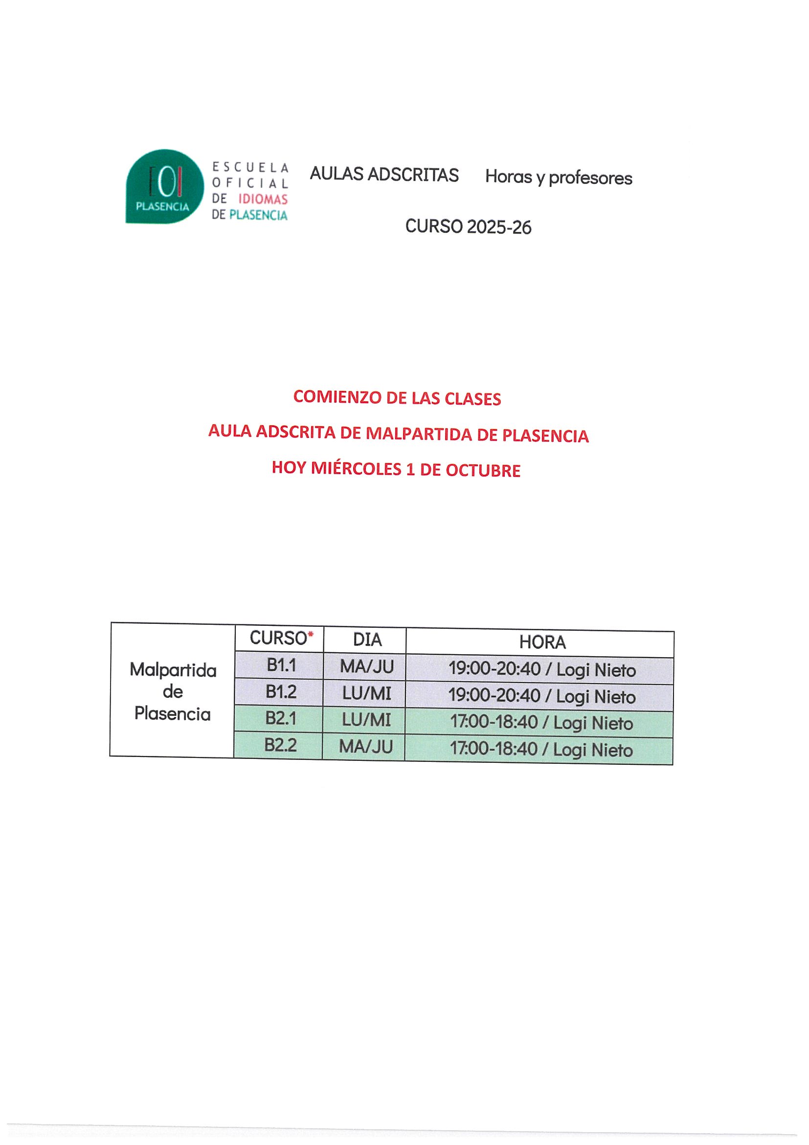 Comienzan las clases del aula adscrita de Malpartida de Plasencia hoy dia 1 de Octubre.