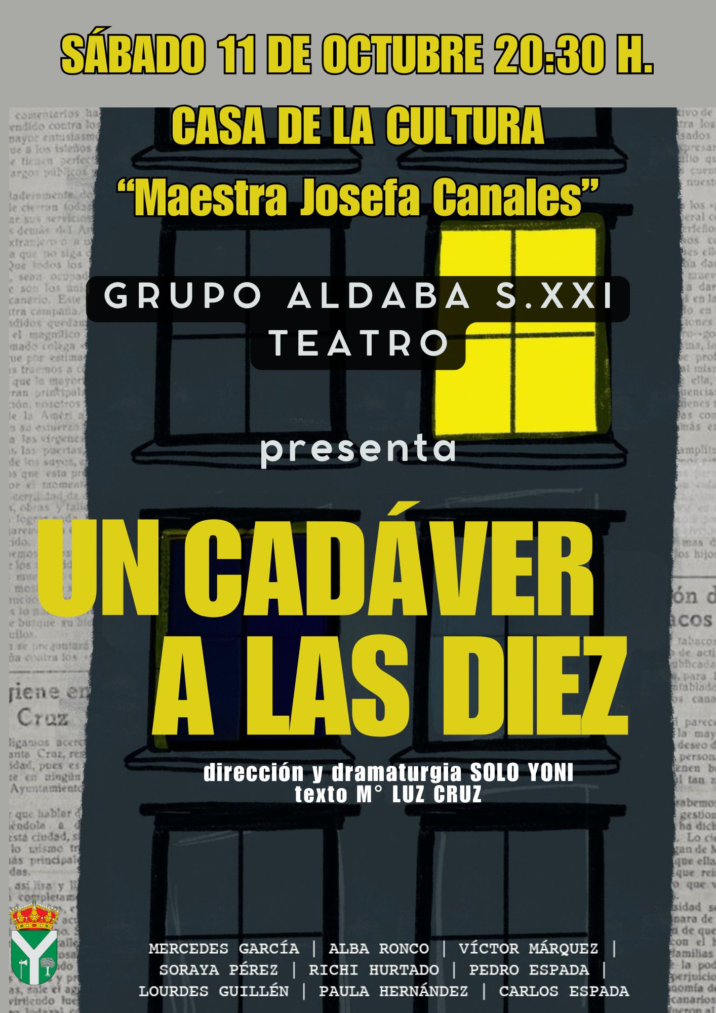 El próximo sábado 11 de octubre, a las 20:30 horas, en la Casa de la Cultura “Maestra Josefa Canales”, tendrá lugar la representación teatral UN CADÁVER A LAS DIEZ, a cargo del Grupo ALDABA S.XXI - Teatro.