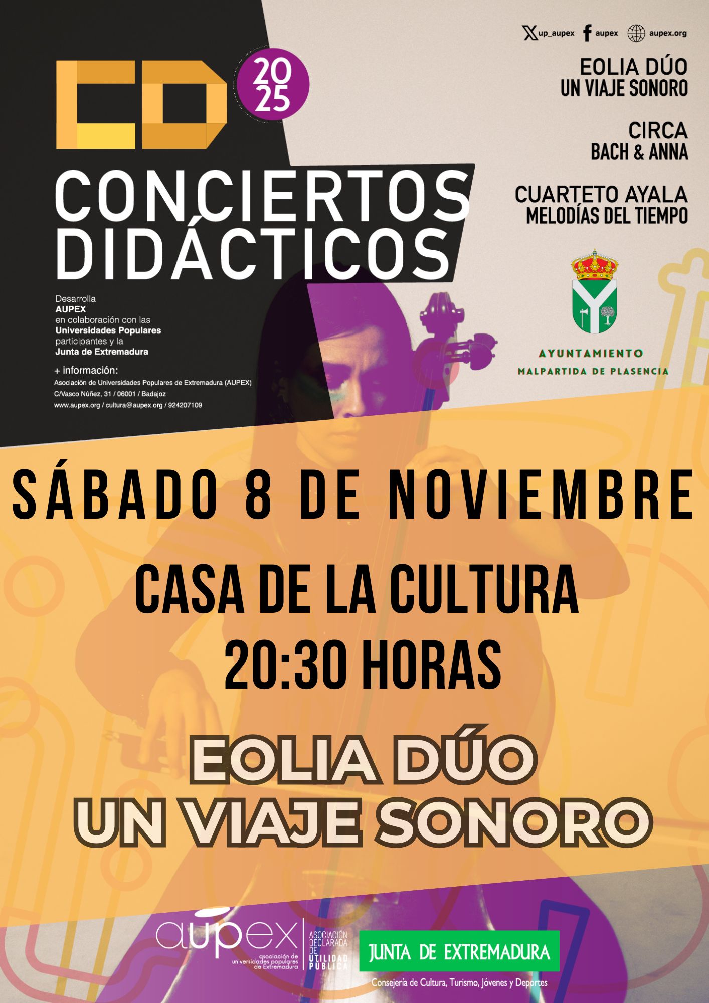El próximo sábado 8 de noviembre, a las 20:30 horas, tendrá lugar en la Casa de la Cultura un concierto incluido dentro del programa Conciertos Didácticos 2025, organizado por AUPEX en colaboración con las Universidades Populares y la Junta de Extremadura.