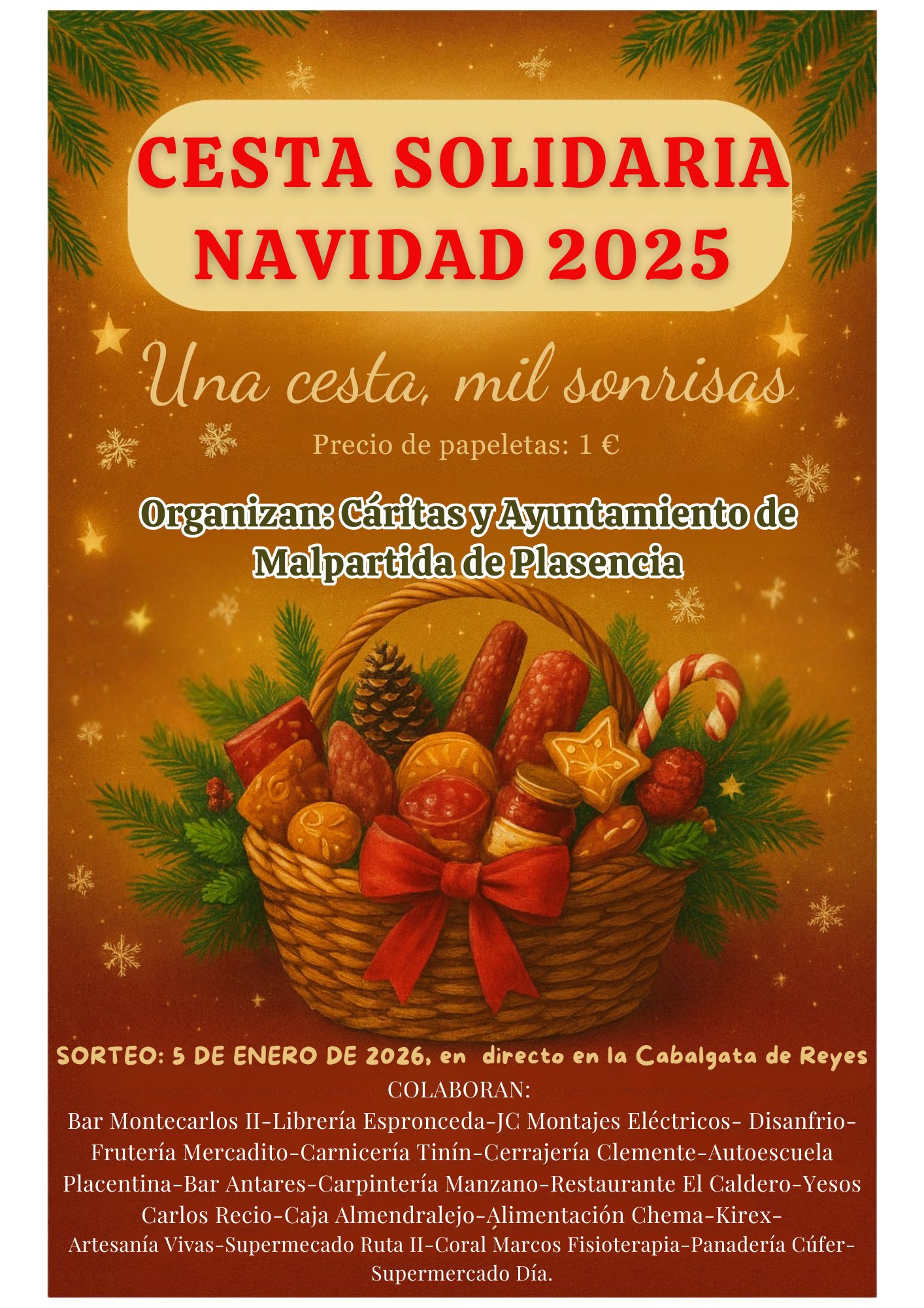 Con motivo de las próximas fiestas navideñas, y en colaboración con Cáritas, se ha organizado la CESTA SOLIDARIA DE NAVIDAD 2025, bajo el lema: