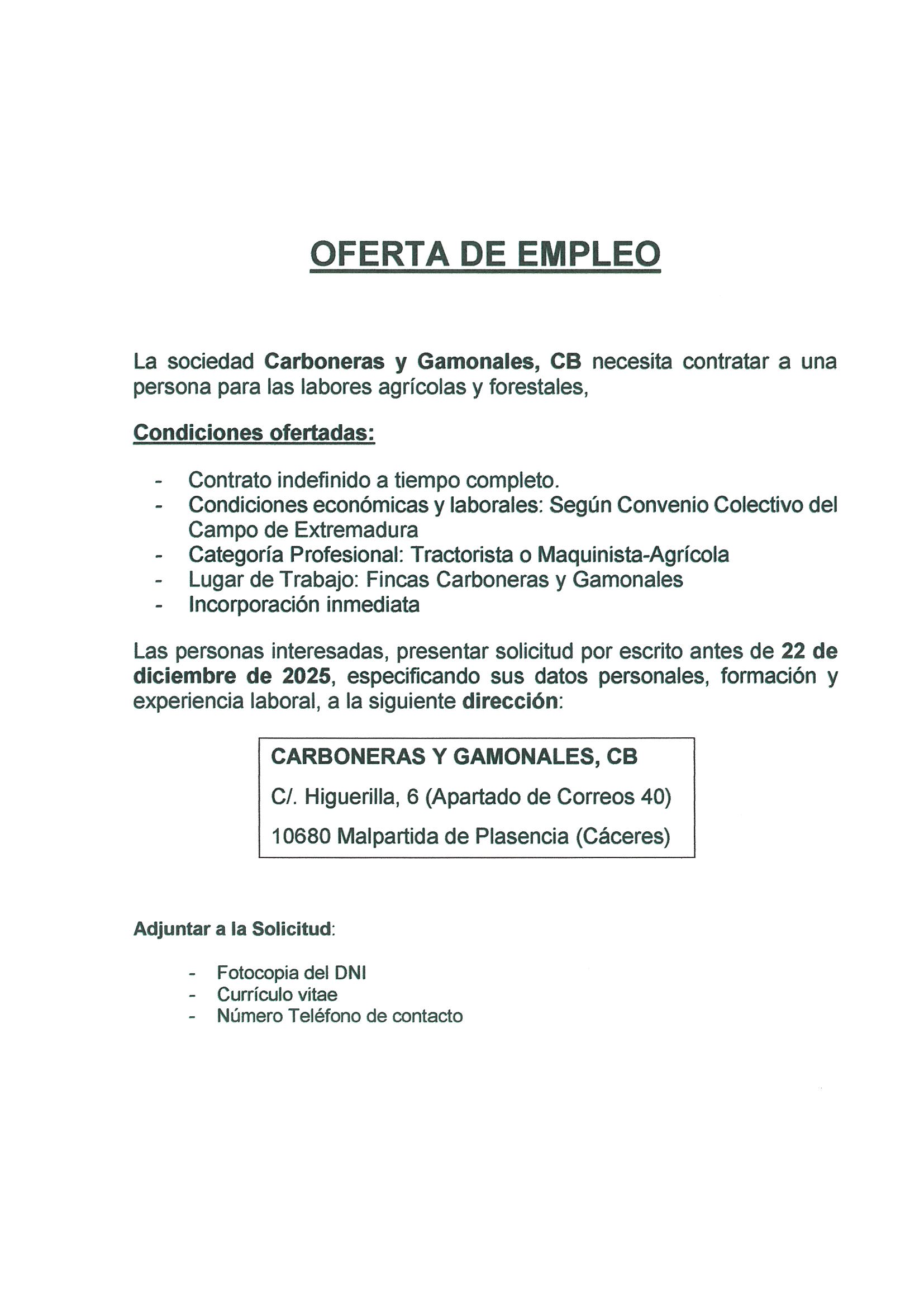 LA EMPRESA CARBONERAS Y GAMONALES, C.B. NECESITA CONTRATAR A UNA PERSONA PARA LAS LABORES AGRÍCOLAS Y FORESTALES.