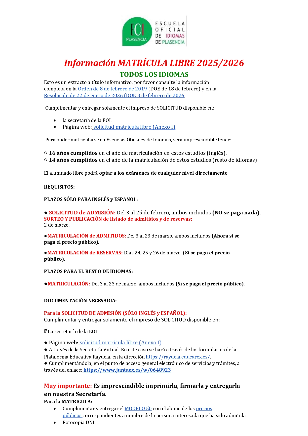 INFORMACION MATRÍCULA LIBRE EOI 2025/2026